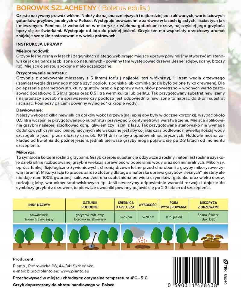 Opakowanie zawiera grzybnie mikoryzową Borowika Szlachetnego do amatorskiej uprawy w ogrodzie.